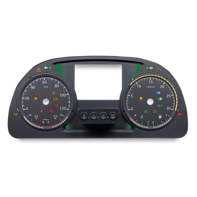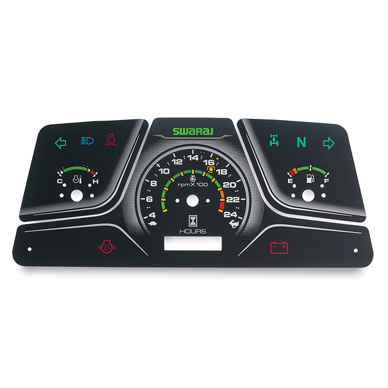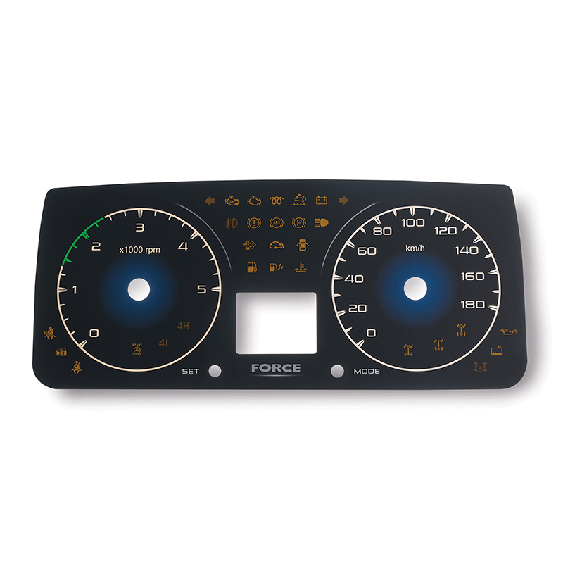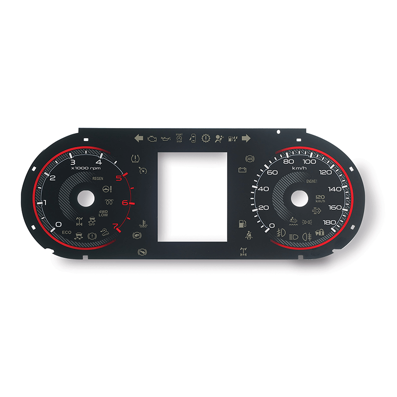 Dials in vehicles display speed, RPM, fuel level, and other essential data, printed using screen printing on polycarbonate, acrylic, or aluminium surfaces for durability and clarity.